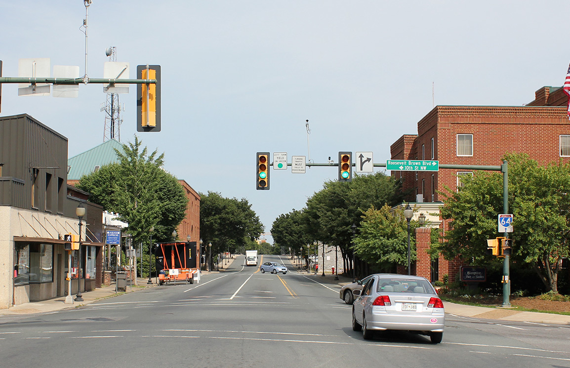 West Main Street, looking east, from the intersection with 10th Street. The earlier image is from sometime in the 1970s and the recent photo from the 2010s. The view has changed even more dramatically in the past couple of years.