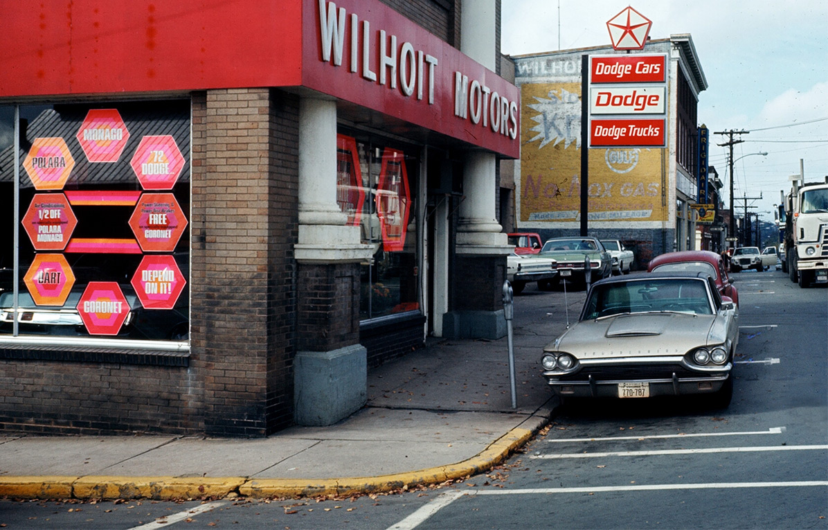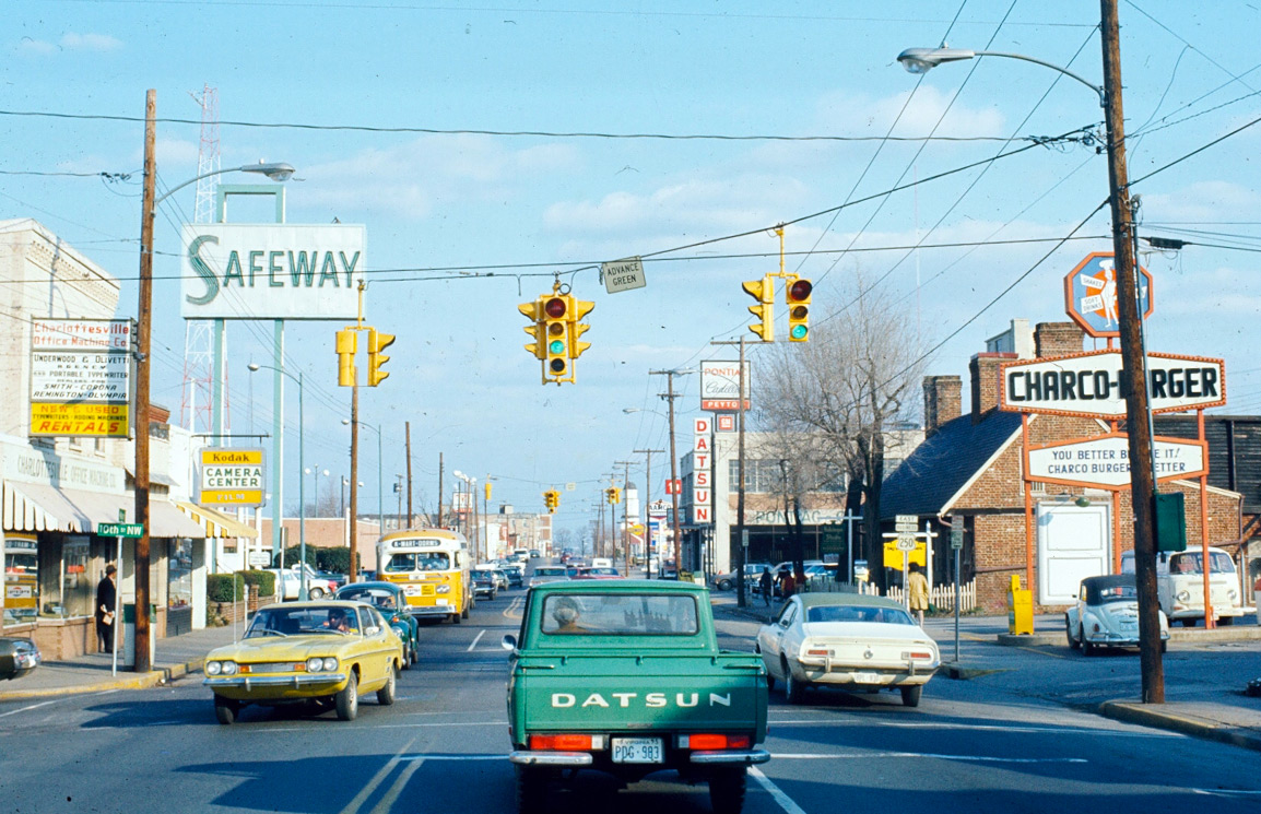 These photos show East Market Street at the corner of 5th Street. The earlier photo was taken in 1971 when Wilhoit Motors had a showroom and garage there, storing many of the automobiles on the roof. The building now contains office space. Car dealerships in Downtown Charlottesville were commonplace throughout the middle part of the 20th Century but slowly the dealerships migrated to West Main Street, and later 29 North and Pantops in search of larger car lots.