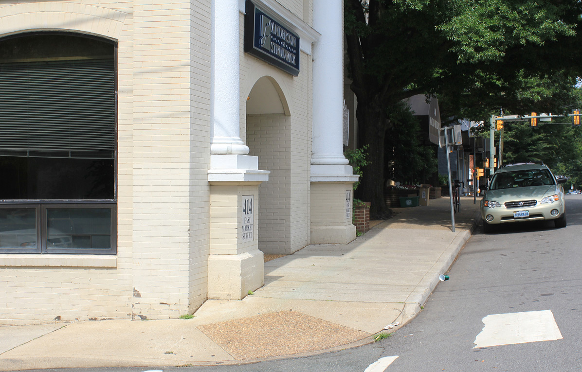 The corner of Garrett and 6th Streets, SE in Charlottesville. The earlier photo was taken over 100 years ago and shows the treacherous terrain of some of the city’s streets back then when both automobiles and horse-drawn carts shared the roads. This part of town contained both residential and industrial properties including many warehouses, only three blocks south of Main Street, today’s downtown pedestrian mall. In both photos you can see the C&O Railroad depot building (in the distance, up 6th St.) which was built in 1905 (although a railroad depot at that location goes back another half-century). Vintage image courtesy Special Collections, UVA Library.