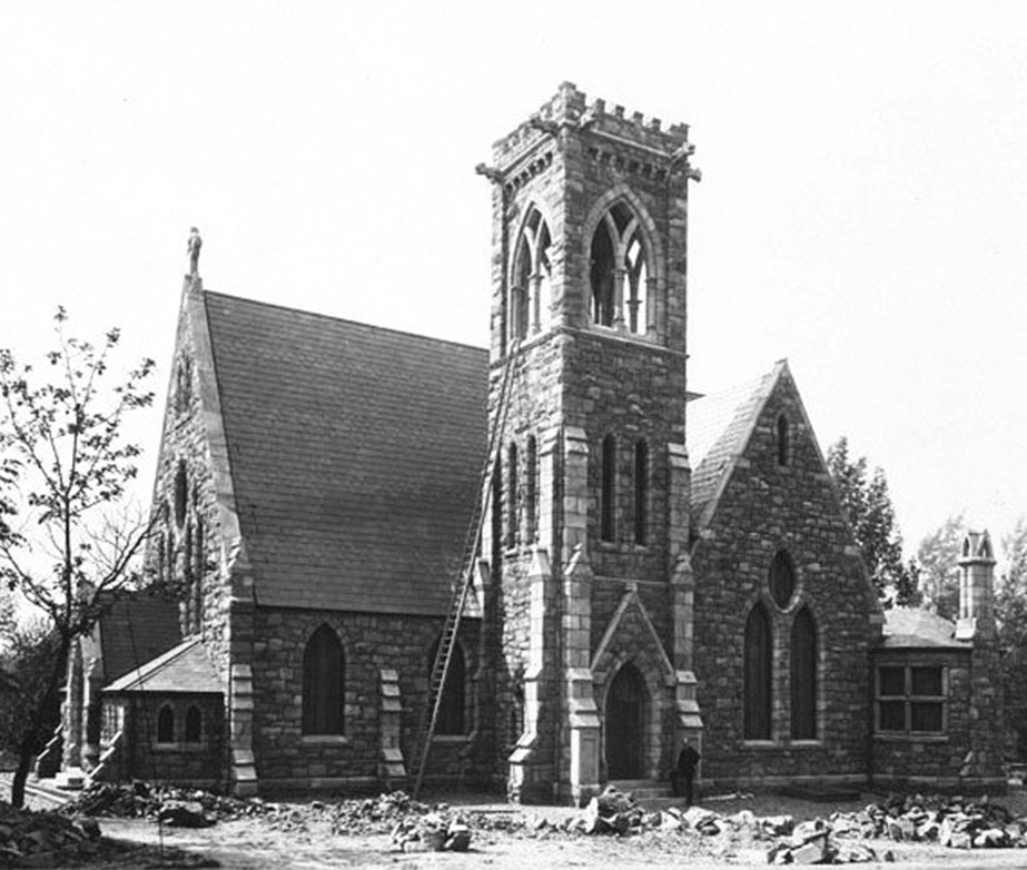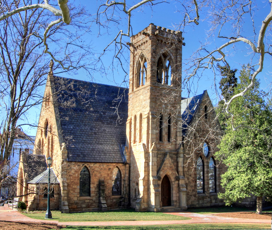 One of the earliest photographs of the Chapel at UVA, this 1889 photo by J.T. Wampler shows the Chapel under construction. It opened in 1890 and with its gothic windows, rough-cut stone, and gargoyles on the bell tower, and stood in stark contrast to the red bricks and columns of the Jeffersonian architecture throughout the Academical Village. Interestingly, Jefferson did not include a chapel in his original plans for the University. The second image shows the Chapel virtually unchanged 125 years later.