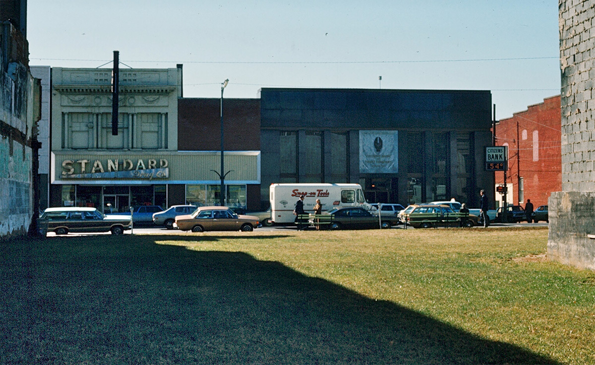 The earlier photograph here was taken sometime after the 1973 fire that claimed McCrory’s and the neighboring businesses on Main Street, but before the downtown pedestrian mall was built a couple of years later. The buildings on the south side of East Main are still easily identified, and the grassy, empty lot is now Central Place, accommodating outdoor seating for the shops and restaurants nearby. The Standard Drug has become a CVS but the architectural detailing on the second story of that building remains unchanged. The Citizens Bank on the the corner in the 1970s image is now the unfinished and abandoned Landmark Hotel project.